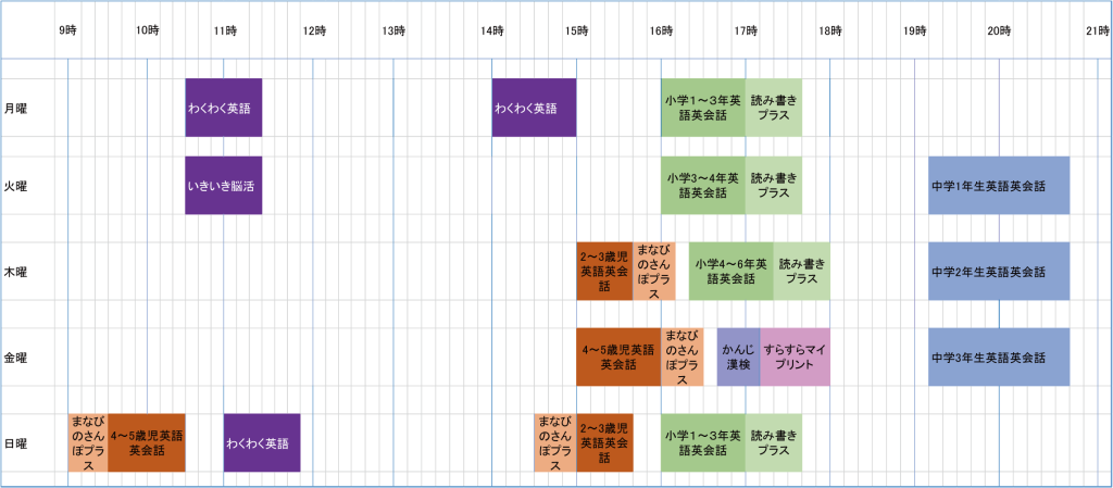 2歳から中学生までのクラスと、シニアの方向けのクラス、英語以外の科目もあります。